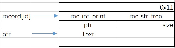 对应的 rec_str_free 函数是,不仅 free 掉 record[id] 指向的 chunk , free 掉 ptr 指向的保存 Text 的 chunk