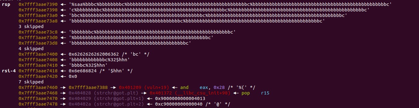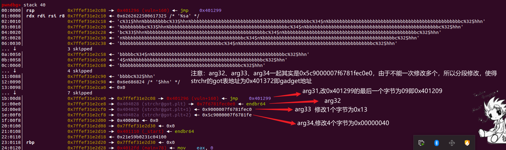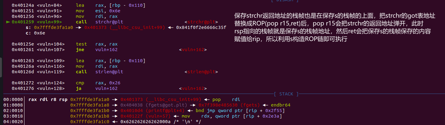 这样就可以通过格式化字符串来控制程序的执行流,比如返回地址, strchr 的 got 表的里的内容。比如把 sprintf 的返回地址修改为 0x401209 即重新回到 vuln 函数,修改 strchr 的 got 表为 ROP 的地址 ( pop r15,ret )