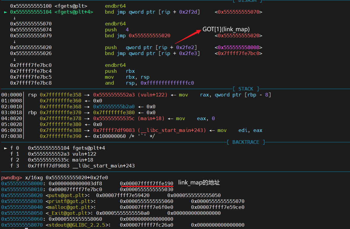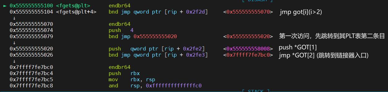 - GOT [2] --> 此处存放的是 dl_runtime_resolve 函数的地址