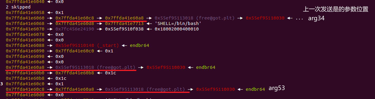 p.sendlineafter("?", "%{}c%89$hhn".format(((free_got)&0xff))) #跳过 free 即把 free@got 改为一个没什么用的指令的地址 | |