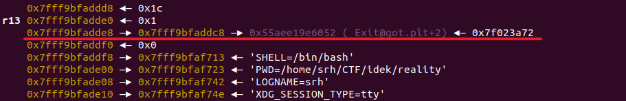 而在程序中 free 函数在 printf之后 ,而 printf 存在格式化字符串漏洞,在正常模式下调试程序,可以发现 _Exit 函数结束后就是 main 的地址了,所以想法是改变 _Exit 的 .got.plt 处的内容使得程序可以一直循环执行。观察到 _Exit 与 free 的偏移差 0x38 ,所以我们可以修改在栈上的 link_map 指向的 l_addr 为 textaddr+0x38 ,这样 free 复写 .got.plt 时写的是 textaddr+0x38+0x4018=textaddr+0x4050