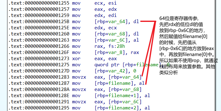 win函数中分析发现对filename的赋值是需要通过栈来中转的,所以考虑进行栈的布局,由于参数分别需要通过栈上的rbp-0x64、rbp-0x68、rbp-0x6C来中转,所以最后考虑如下的栈布局| old_rbp+0x6C | <- rbp | ret win(skip the satack operate) | | 0xa000000l000000 | <- old_rbp | 0x.......f000000 | <- old_rbp+0x6C-0x64 | | ... | |<- old_rbp+0x6C