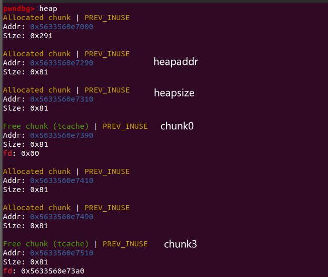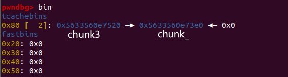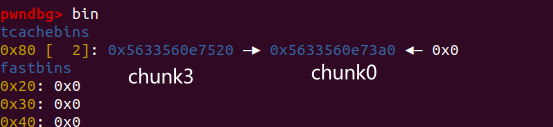 delete(3) #tcache 先进后出 chunk3=>chunk0 | |