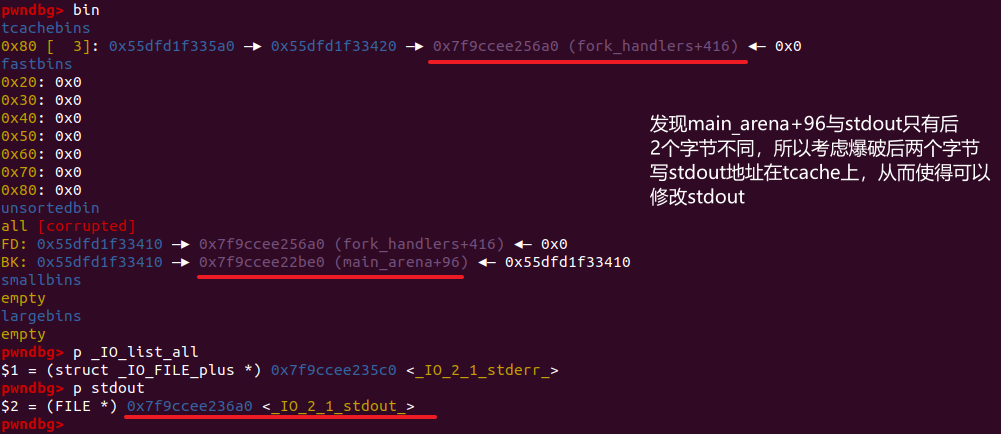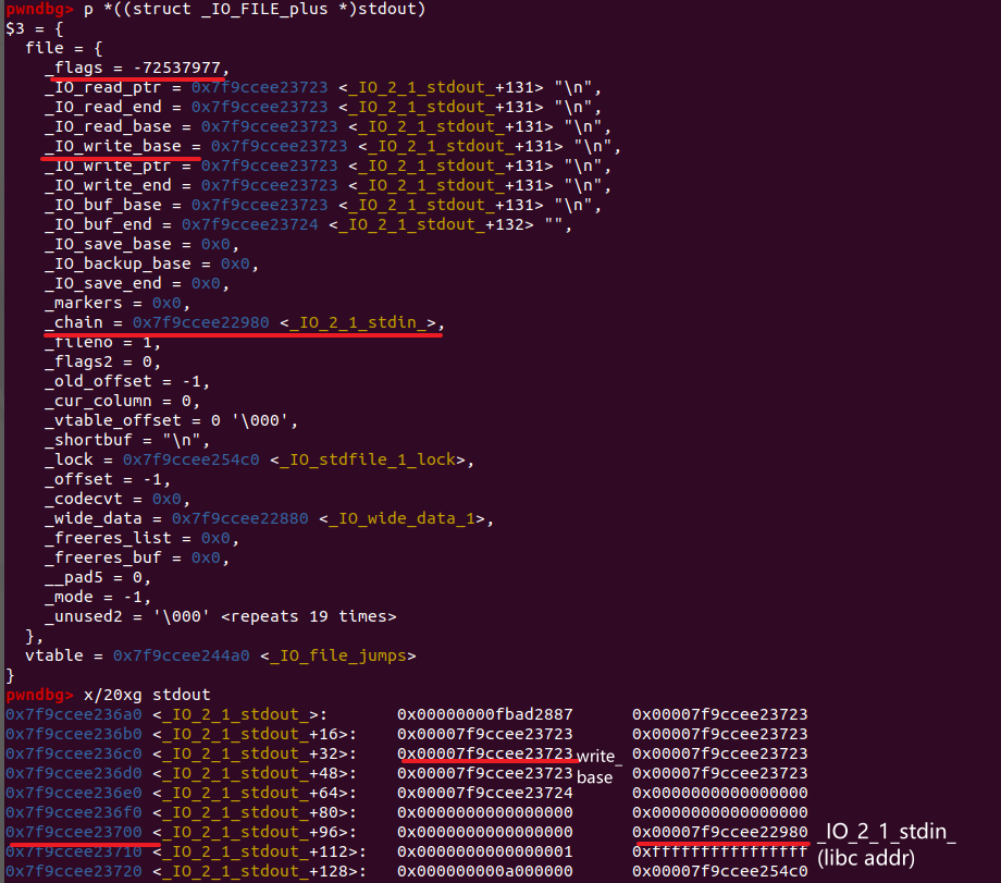 申请到 stdout ,然后修改 stdout 的结构体的 flag 、 write_base ,使得可以读出 libc 上的地址 _IO_2_1_stdin_