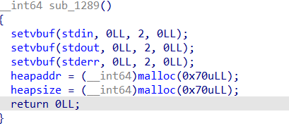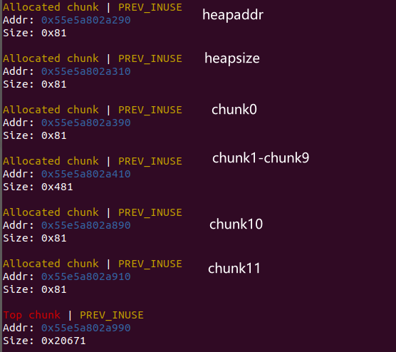 可以发现我们释放的 chunk3 存在于 0x291 大小的 chunk 中,而我们 edit 的时候可以写入负数大小的 index,并且 heapaddr 数组也是通过 malloc 申请的,而题目中具体的写入位置是 heapaddr+index*8LL ,计算偏移