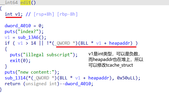 没有常见的漏洞,但存在一个可以写负数的漏洞,使得我们可以改写 tcache_struct