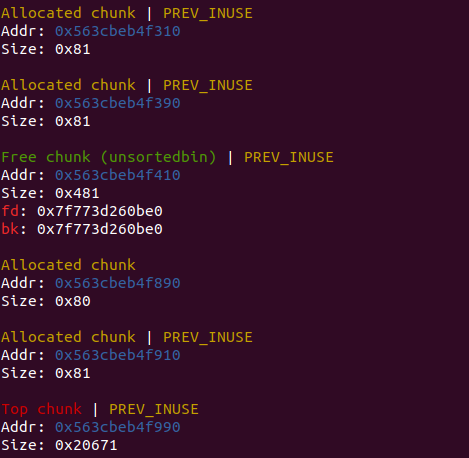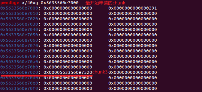 而这个一开始分配的 chunk 的大小就是平时我们看到的最上面的大小为 0x291 的 chunk