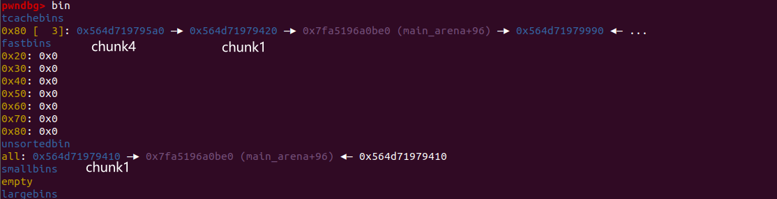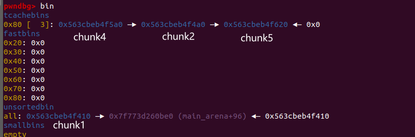 利用 part1 同样的手法,通过修改 chunk4 的 fd 的后两个字节来把 chunk1 链入 tcache 中,此时 chunk1 即在 tcache 中也再 unsorted 中