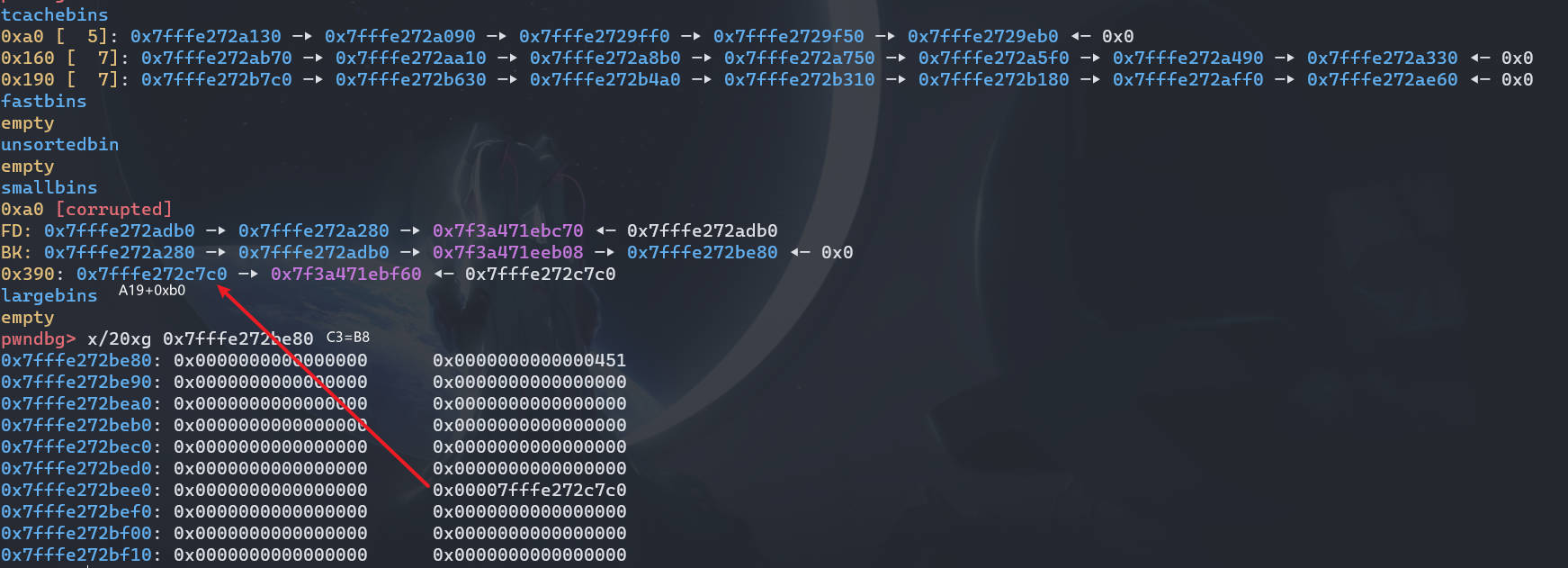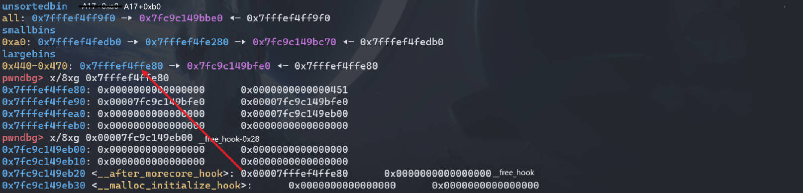 接着触发 largebin_attack,注意这里虽然申请的是 0xa0 大小的,并且 unsortedbin 中只有比这个大小大的 chunk (A17),但 unsortedbin 的分配机制是:会先把 A17 放入 largenbin,再分割申请所需的大小出去,剩下的再插回 unsortedbin。所以仍然会触发 largebin_attack