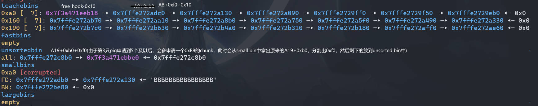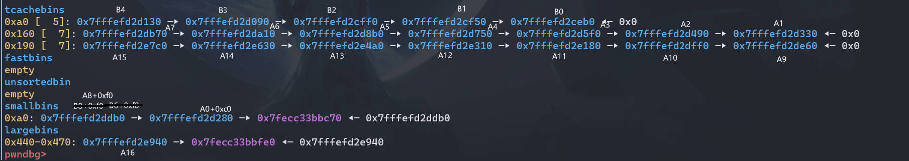 Add(0xe0, 'B'*0x38) # B6 split 0x190 to 0xf0 and 0xa0 再次划分 A8,因为 small bin 中至少要两个才可以触发 | |