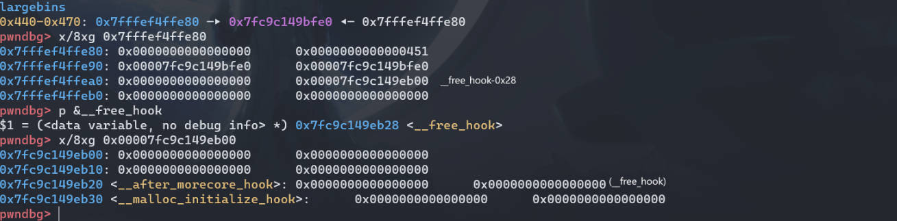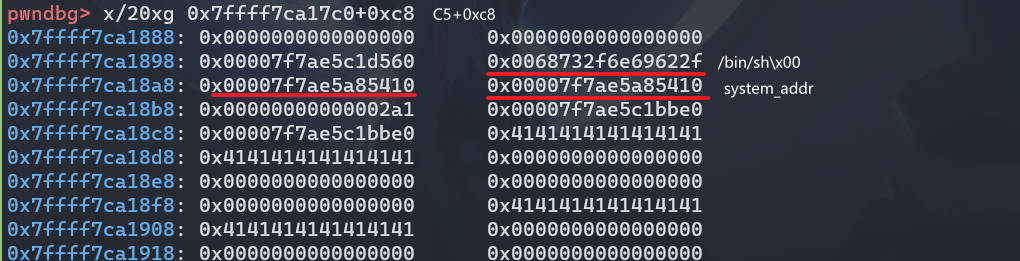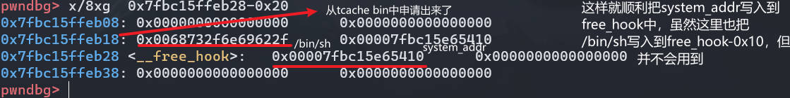 由于我们的 fake_IO_FILE 后面跟着 b'/bin/sh\x00' + 2*p64(system_addr) ,那么把从 /bin/sh\x00 开始的地址写入 0x18 到 __free_hook-0x20 即可满足要求