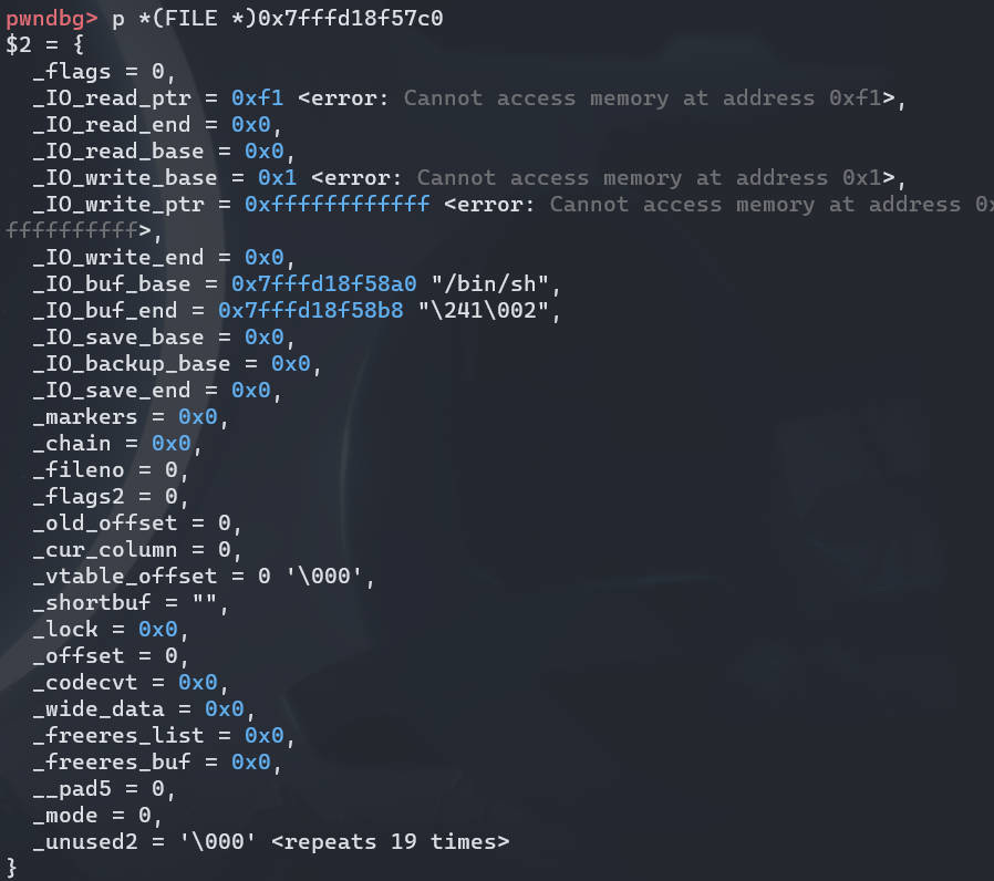 fake_IO_FILE += p64(1) #change _IO_write_base = 1 | |