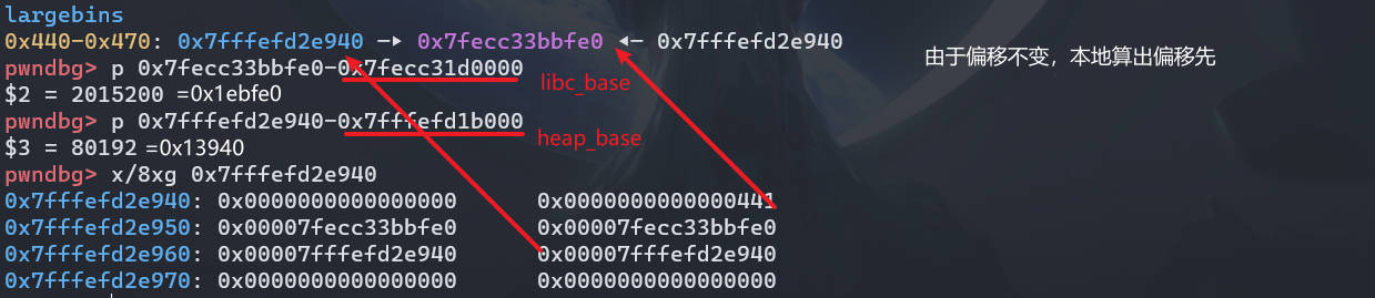 创建一个可以放入 largebin 中的 chunk (A16),然后利用 UAF 泄露地址,可以本地先算偏移