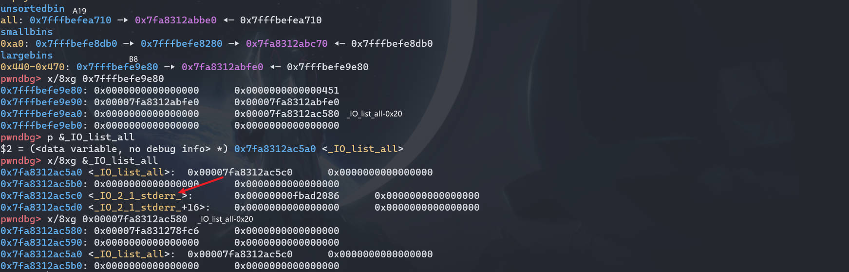 往 _IO_list_all 相关的地址写入堆上的地址,方便我们触发伪造的 IO 链
