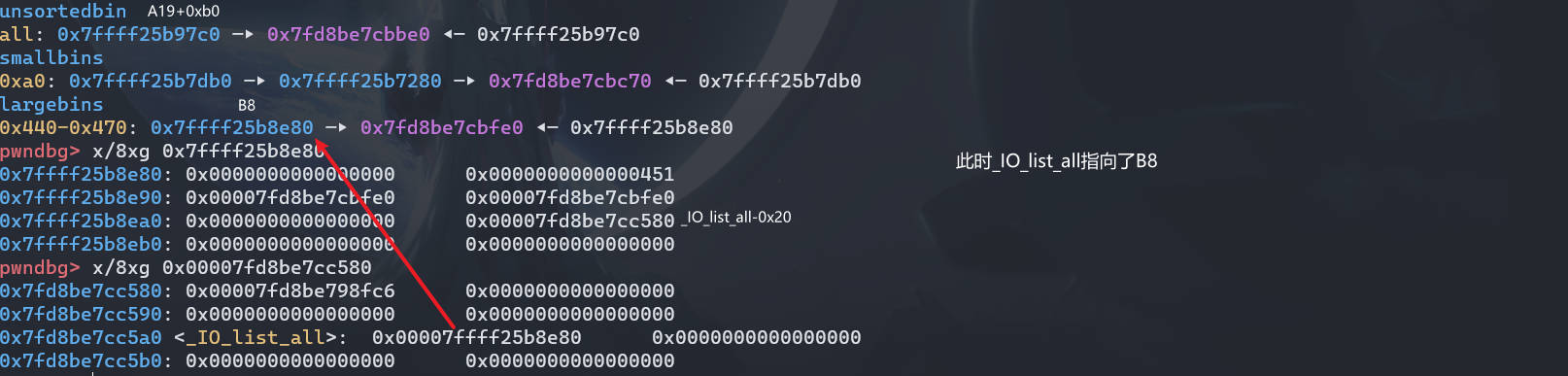 此时 __free_hook-0x8 的地方就写上了堆上的地址 (B8)