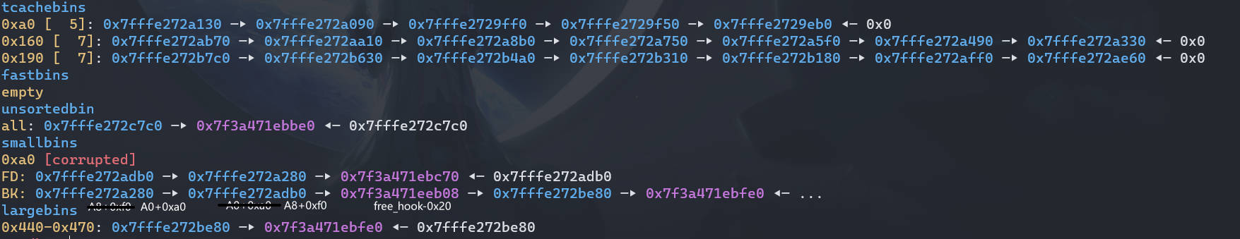 此时smallbin中的布局,`free_hook-0x20`被成功写入到smallbin中 |