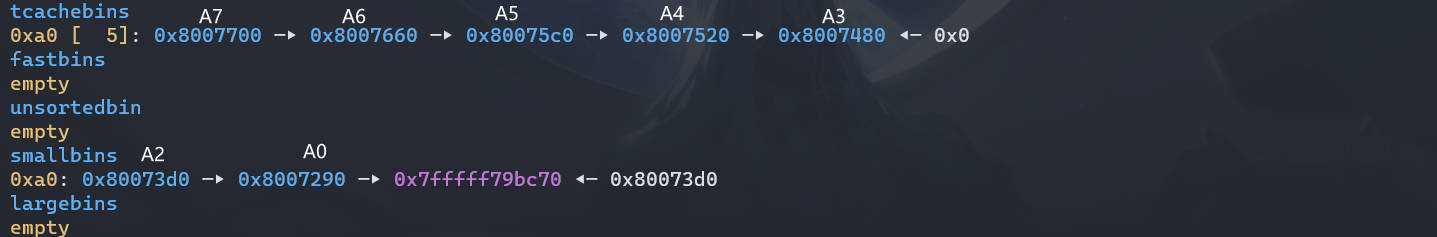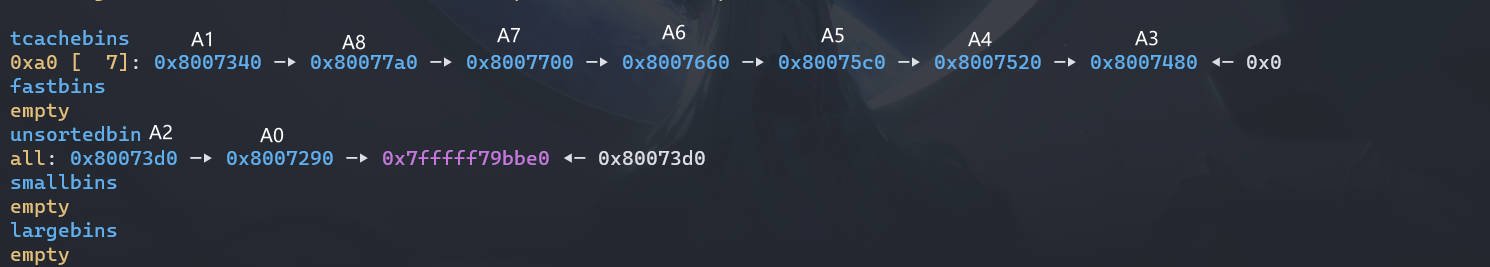 创建 9 个堆 (0-8),大小在 tcache bin 之内,然后释放 chunk1 和 chunk3-8,将对应的 tcache 填满,然后释放 chun0 和 chunk2,此时会放入 unsortedbins 中,又由于中间有一个 chunk1,所以不会造成 chunk0 和 chunk2 合并