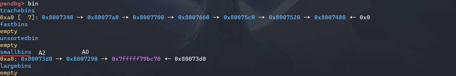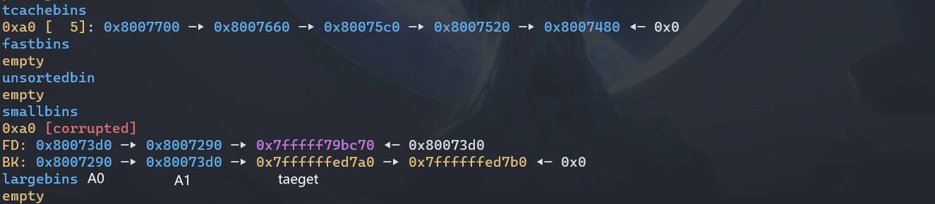 - 攻击机制:tcache bin 中有剩余(数量小于 TCACHE_MAX_BINS)时,同大小的 small bin 会放进 tcache 中,这种情况可以使用 calloc 分配同大小堆块触发,因为 calloc 分配堆块时不从 tcache bin 中选取。在获取到一个 smallbin 中的一个 chunk 后,如果 tcache 任由足够空闲位置,会将剩余的 smallbin 挂进 tcache 中,在这个过程中只对第一个 bin 进行了完整性检查,后面的堆块的检查缺失。当攻击者可以修改一个 small bin 的 bk 时,就可以实现在任意地址上写一个 libc 地址。引用 holk 的说明。(而要想将 chunk 不放入 tcache bin 中,需要先分配一个放入 unsorted bin 中的 chunk,然后分割) 这个 chunk 使得剩余的 chunk 符合大小要求进入 small chunk)