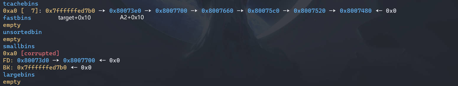 利用 calloc 创建一个和一开始创建的堆的大小的堆,此时 chunk0 会被重新使用,而 chunk2 和目标地址会被分配到 tcache 的空位中,此时申请一个对应大小的 chunk 即可在目标地址获得一个 chunk